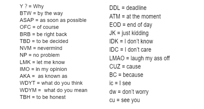 当然在chatting 的过程中可能会遇到一些难题,比如说看不懂他们的缩写或者流行语等,这里给大家整理了一些比较常用的英文缩写: