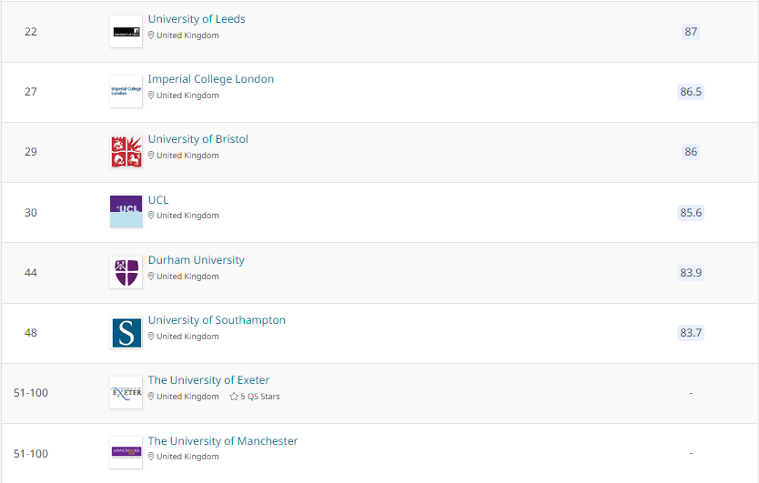 在最新的2022 年QS地理学专业排名中,英国院校榜单如下: