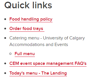 和很多大学一样,卡尔加里大学的餐饮服务也可以在辅助服务里面找到,或者直接搜索Food Services,就能得到下面通往各个和餐饮服务相关的链接: