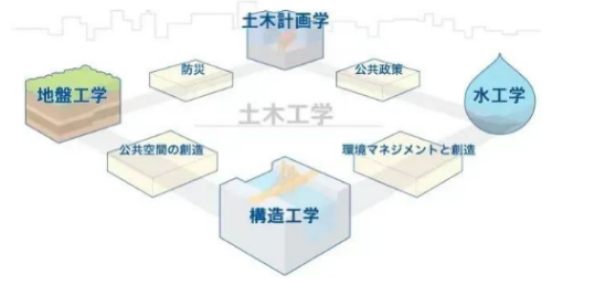 日本土木工程学一般四个领域构成,分别是:“构造工学”、“水工学”、“地盘工学”、“土木计划学”。