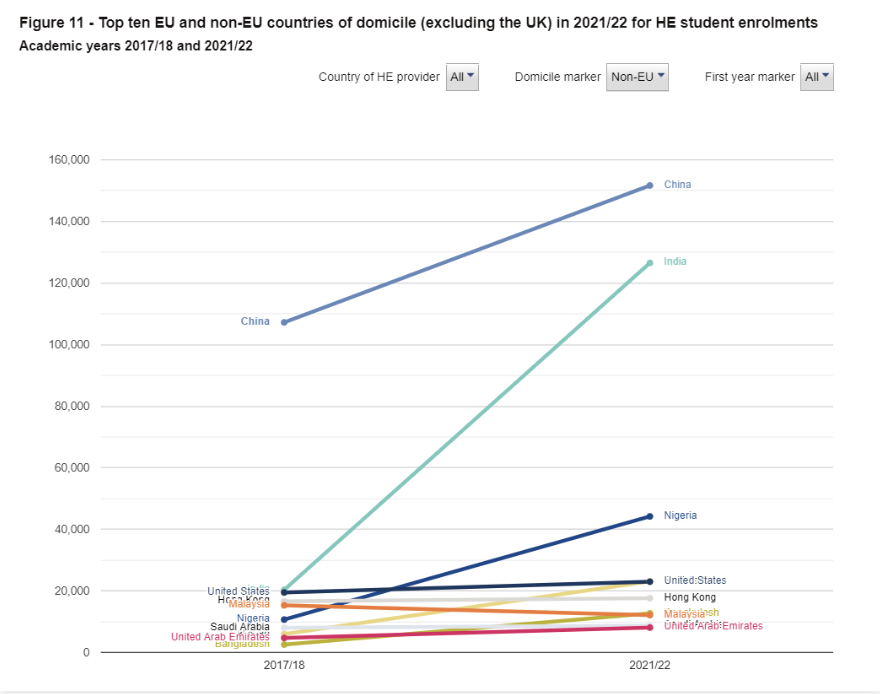 尤其是,从疫情前开始,在17/18至21/22的五年期间,来自中国的学生人数 增加了44,475人,暴涨42%!