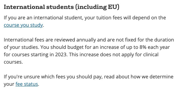 在2023年的QS排名中,布里斯托大学位居世界 TOP61 ,在全英排名 TOP9 。对于学费来说,不同的专业学费标准不同,并且对于2023年入学的学生来说,学费会根据每年 8% 来递增,临床课程除外。比如说: