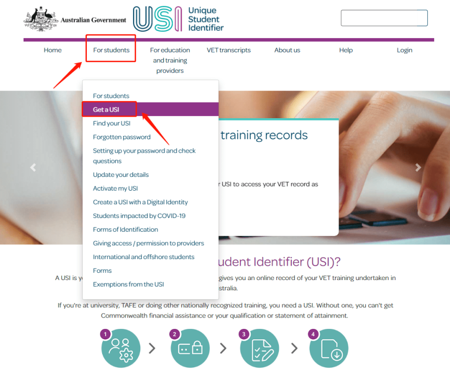 在澳洲学习的国际学生, 在入境后签证将被激活 ,就可以着手申请USI了! 首先,输入网址USI的官网,在这个主页面靠上左有一个“ ForStudent ”的类别,点击里面的“ Get aUSI “。