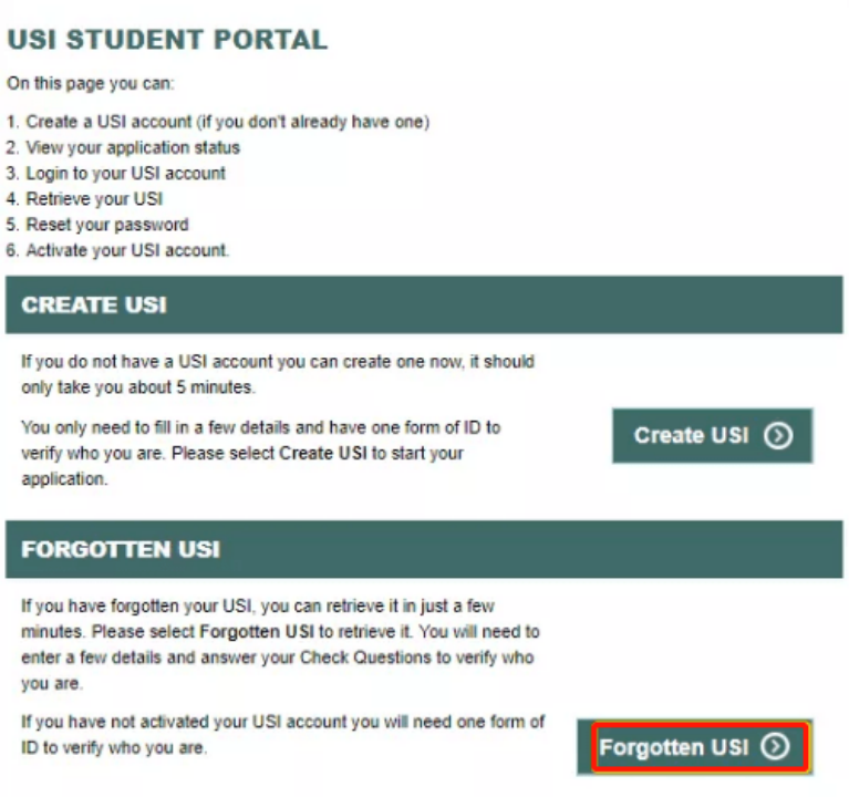 忘记账户?如何找回USI? USI是每位同学一生只有一个的号码,永远都不会改变!如果不小心忘记了自己的USI,只要回到创建页面,点击“Forgotten USI”找回号码就好啦!