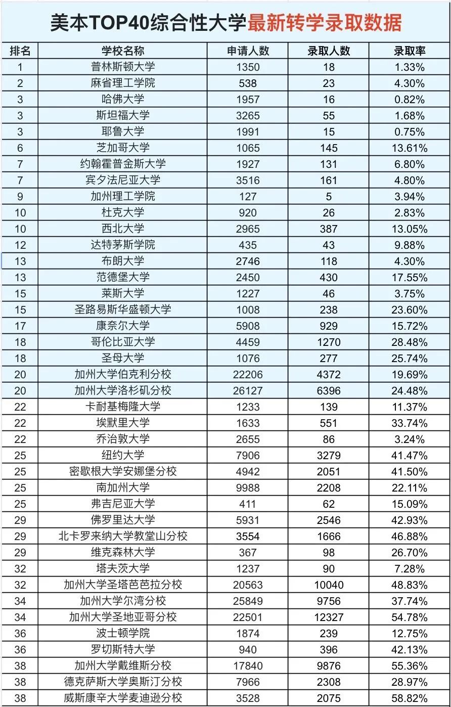 总的来说,除了几所本来录取率就极低的顶尖学校,其他学校的转学录取率还是非常高的。如果对目前的学校不满或者想转入更好的学校, 转学确实是一个非常好的机会 。
