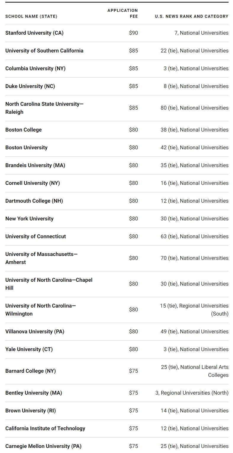 ▲ 美国部分申请费较高的大学名单和排名