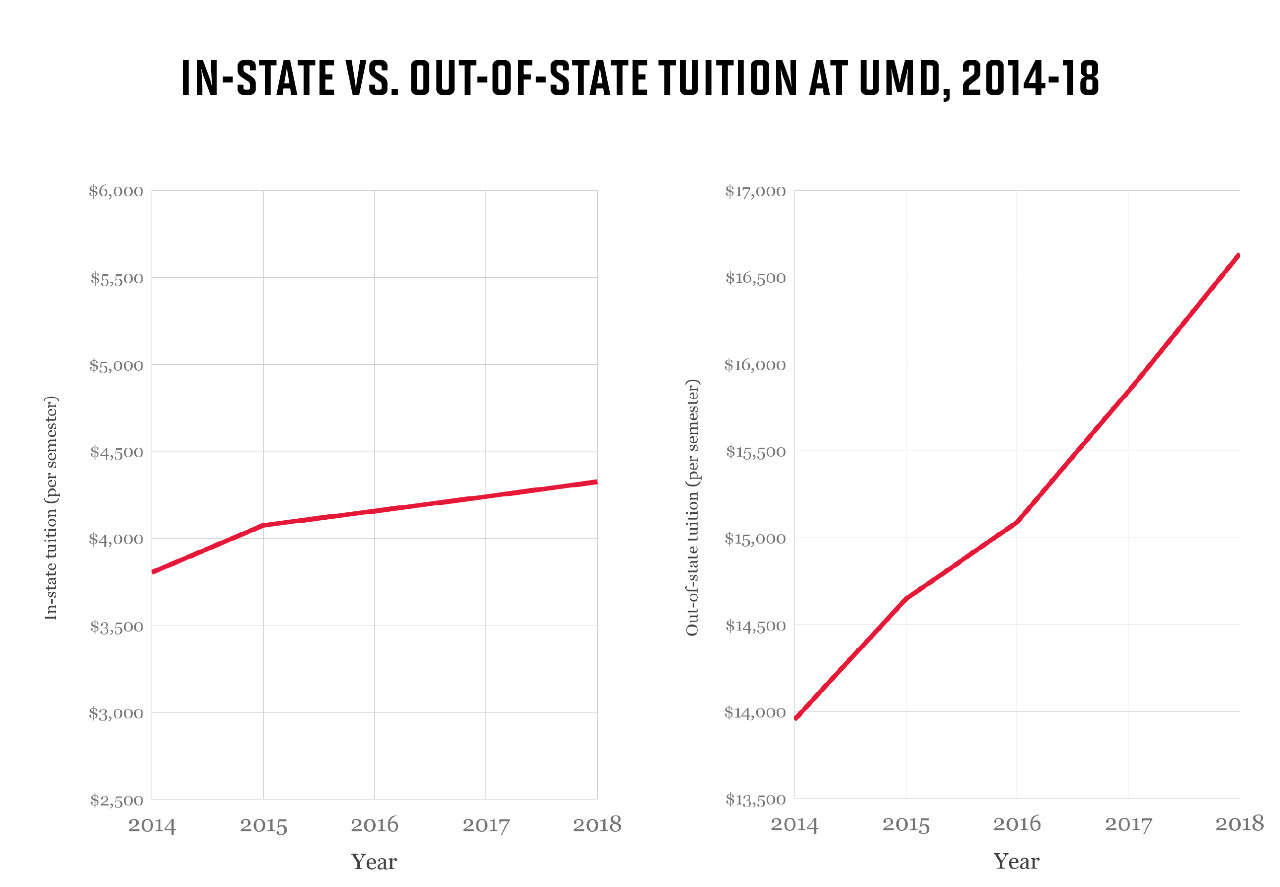 ▲ 美国马里兰大学2014-2018年间,州内学生学费和州外学生学费涨幅对比,国际学生执行州外学生学费标准