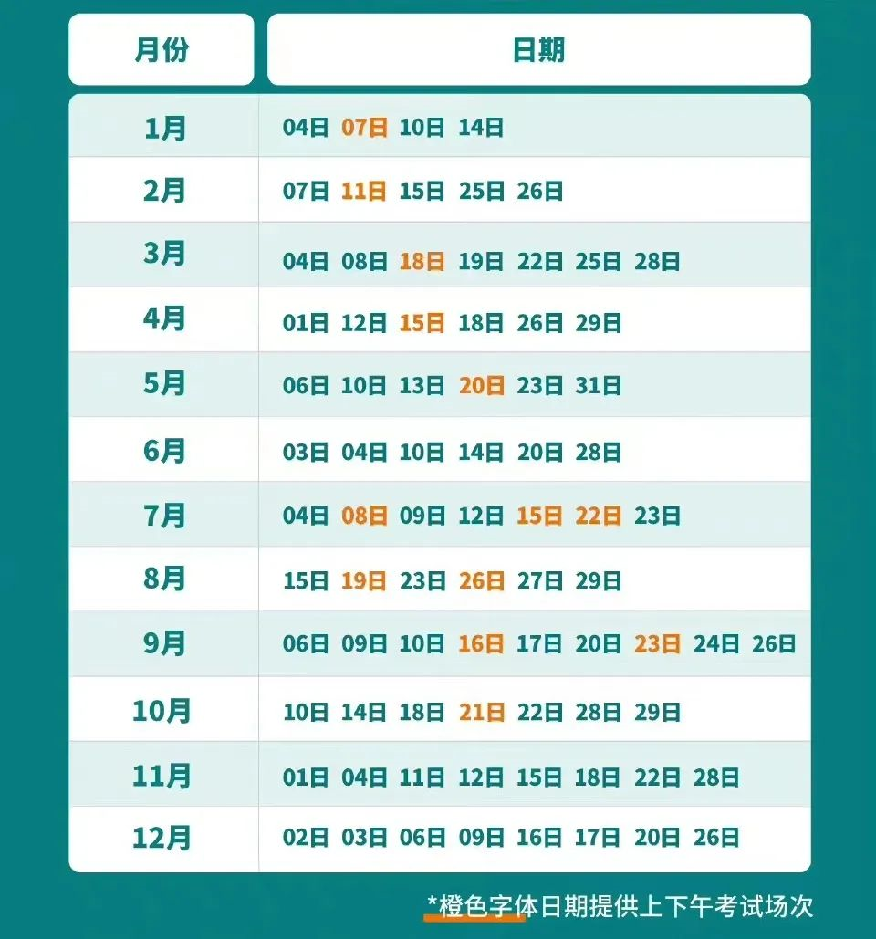 5、在右侧时间栏选择自己想报考的月份和日期,绿色为仍有考位的日期,点击后可查看是上午还是下午有考位;