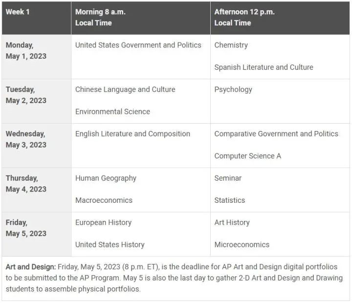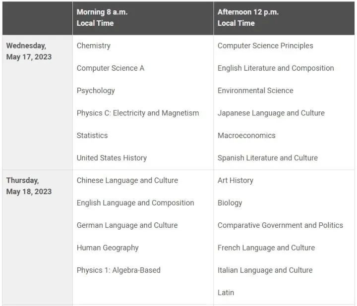 2023年AP考试将在5月1日至5日和5月8日至12日的两周时间内在学校进行考试,5月17日至19日为AP延迟考试时间(AP协调员为希望同时参加考试的学生安排备用考试)。