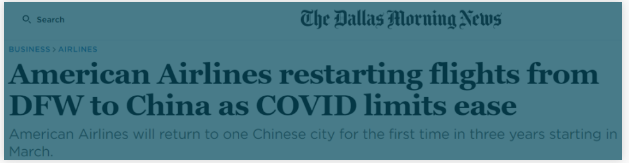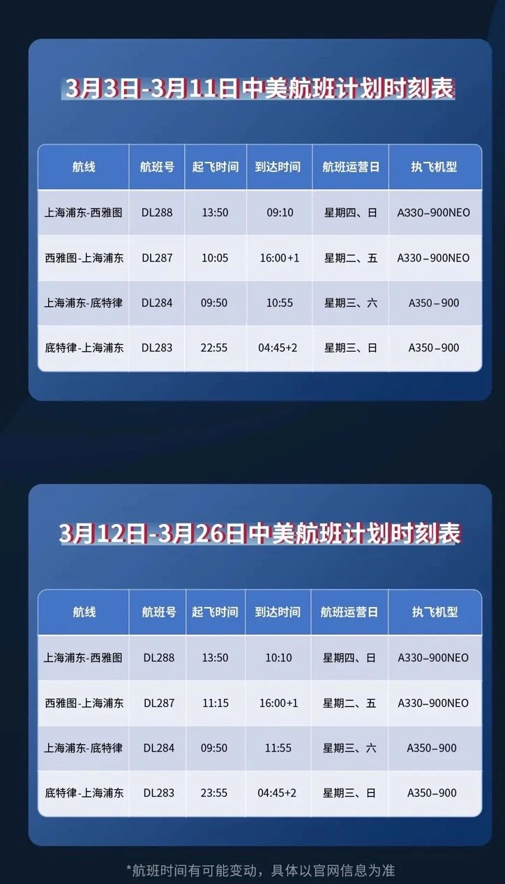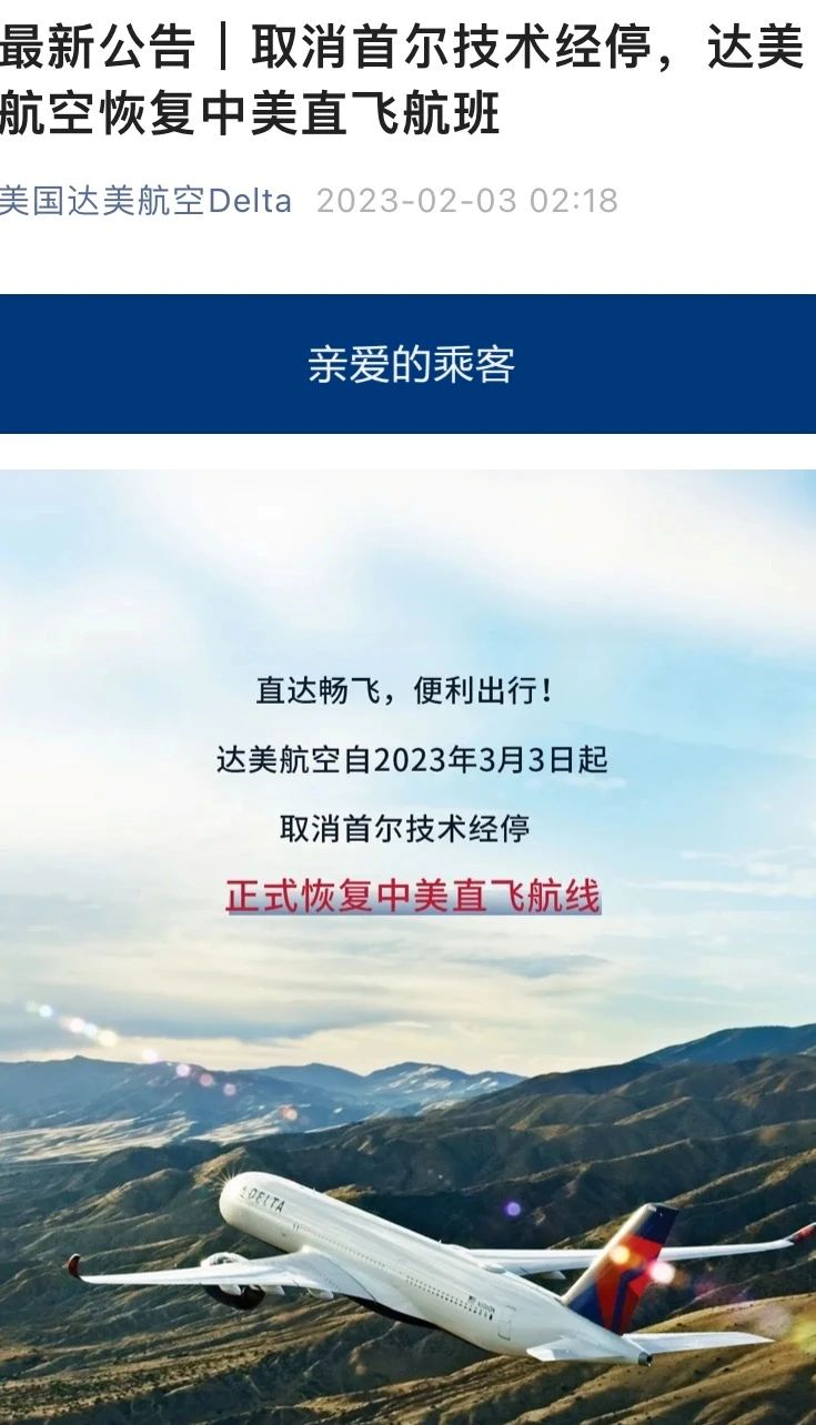 与此同时,美国达美航空微信公众号2月3日也表示,达美航空自2023年3月3日起取消首尔技术经停,正式恢复中美直飞航线。
