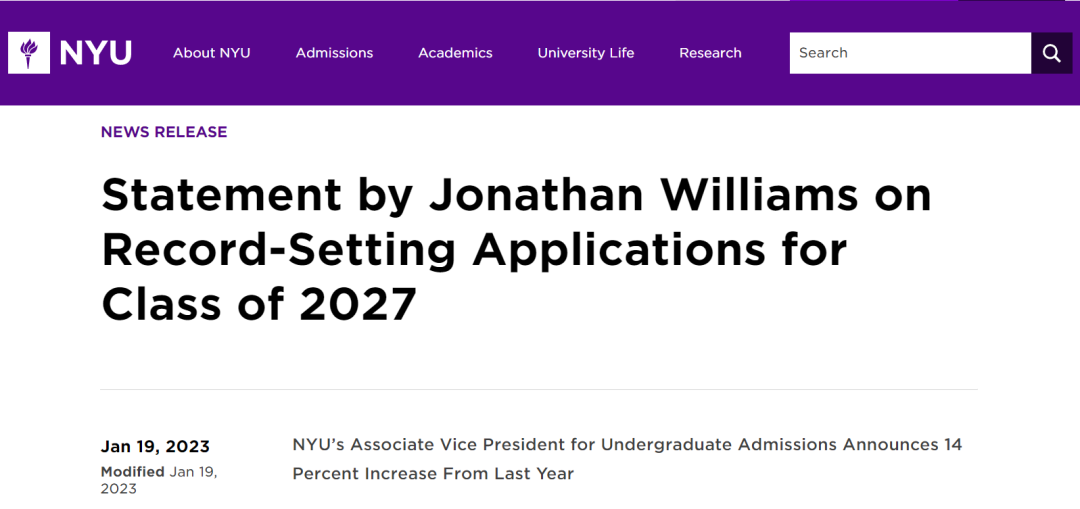 纽约大学1月19日宣布:今年共收到近12万份2027届新生申请,比去年(10.5万份)增长了13%,这是NYU连续第16年申请人数创下新纪录!这也意味着,NYU的申请竞争越来越激烈。