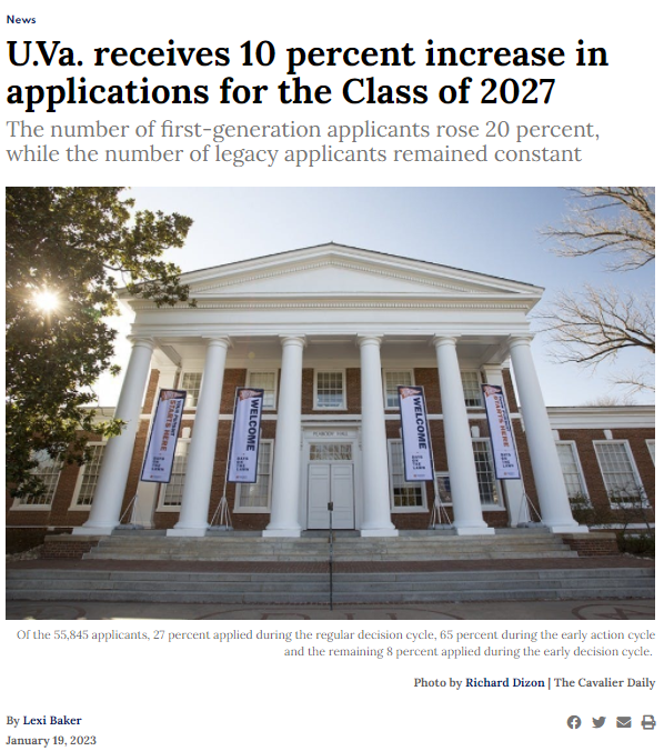 根据弗吉尼亚大学(UVA)官网数据显示,该校今年共收到55,845份新生申请,创历史新高,比去年(50,813份)申请增长了10%!