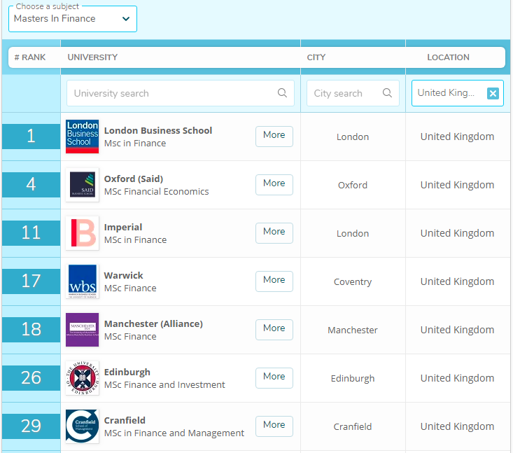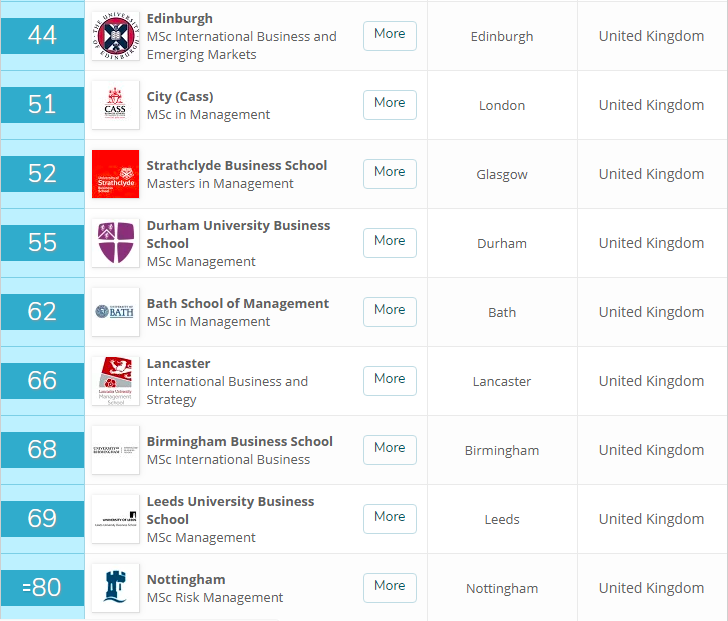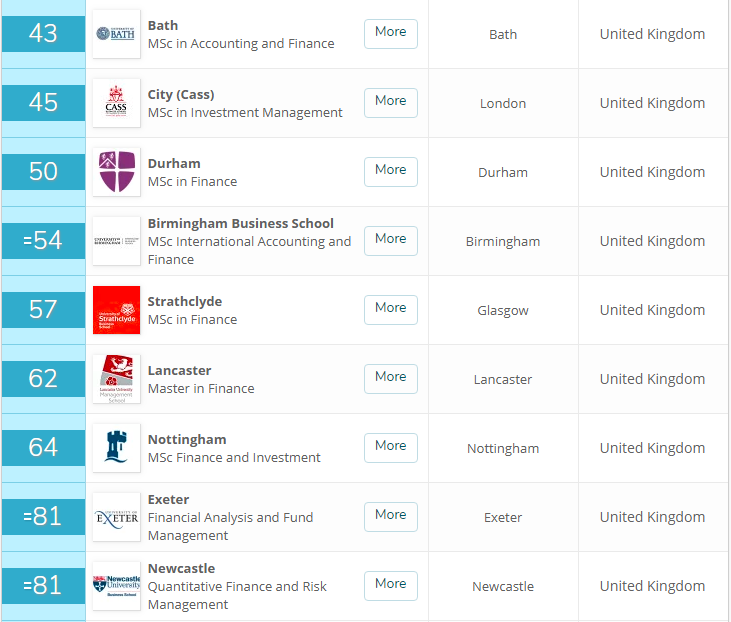 最新的QS商科排名分成了金融类和管理类,下面分别给大家看一下每个专业方向的排名