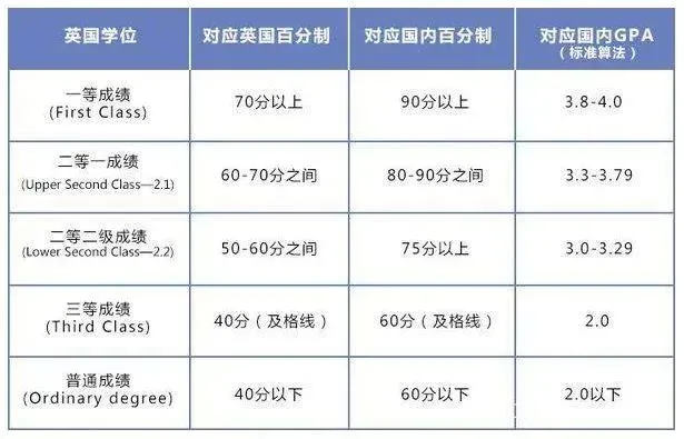 英国大学惯用几等档制来划分学生的成绩,一等成绩(First Class),二等一成绩(Upper Second Class—2.1),二等二级成绩(Lower Second Class—2.2),三等成绩还有普通成绩。而与国内本科不同的是,英国本科的及格线是40分。