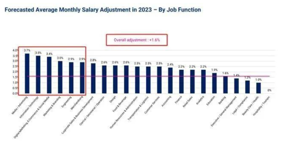 根据JobsDB最新公布的《2023年招聘、薪酬及福利调查报告》得知:2023年香港打工人薪酬平均增加1.6%,跟2022年相比下降了0.1%;而涨薪幅度最高的行业则是「资讯科技(IT)」,平均增幅达到4.5%!此外,「广告/PR/市场营销」平均增幅也有4.1%。