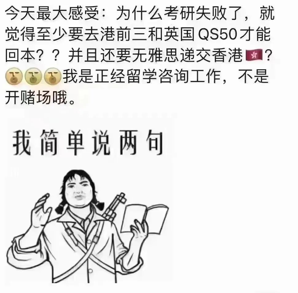 一部分失利的同学, 在什么都没准备的情况下,马上联系机构咨询出国留学 ,导致下面这条朋友圈截图在留学工作圈里疯传: