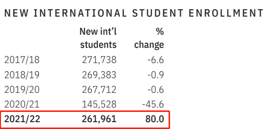 美国国际教育协会(IIE)发布的《2022美国门户开放报告》显示,新入学的国际生人数相比上年度增长了80%,缓解生活回归常态后,美国依然是全球最具吸引力的留学目的地。