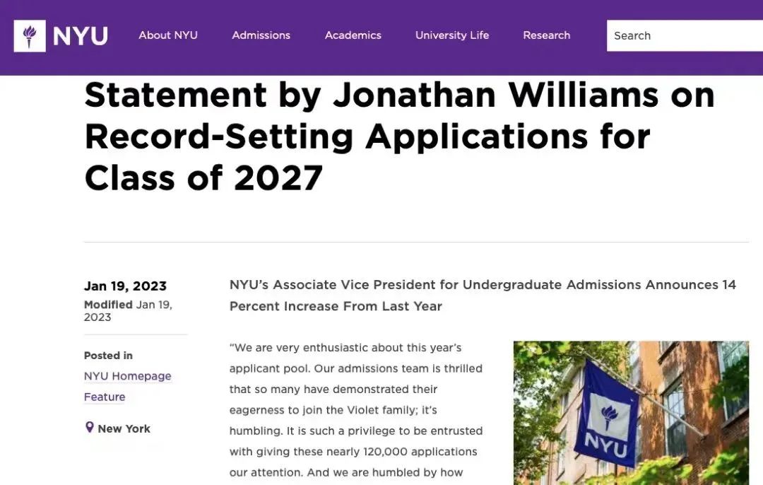 纽约大学今年收到了近12万份2027届的申请,比去年创纪录的105,000份又增长了13%。 其中包括近2.2万份早期决定申请(Early Decision),比去年增长了14%。这是连续第16年申请纽约大学的人数创下纪录。