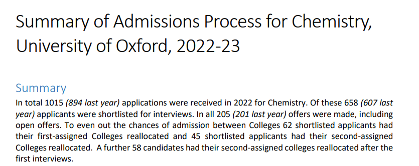 2022年牛津化学专业共收到 1015份 申请(去年为894份),增加了 121 人,其中658人(去年为607人)入围了面试,但最后一共发放了205份(去年是201份)offer,offer率为 20% ,相较去年 下降了2% 左右。