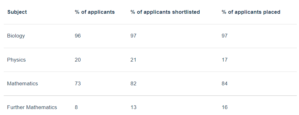 2022年使用Alevel成绩提交申请的学生除了必学化学, 96% 选择了生物, 20% 选择了物理, 73% 选择了数学, 8% 选择了高数;申请者中有 61.7% 正在/已经完成了3门Alevel, 32.2% 正在做4门, 3.4% 正在做5门或更多Alevel科目。