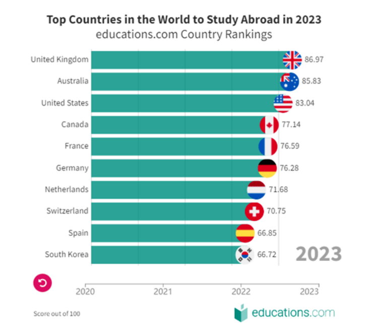 世界知名的教育网站education.com发布的“2023全球十大留学国家榜单”中,澳洲位列世界第二,再一次证明了其留学大国的身份。
