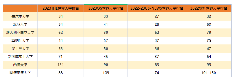 在世界大学的几个权威排名中,澳大利亚的大学都一直维持着出色的表现,尤其是澳洲的八大的表现极为亮眼,澳洲八大中的大部分学校,一直稳居全球前100。 墨尔本大学 更是一直 位居全球30名左右 。