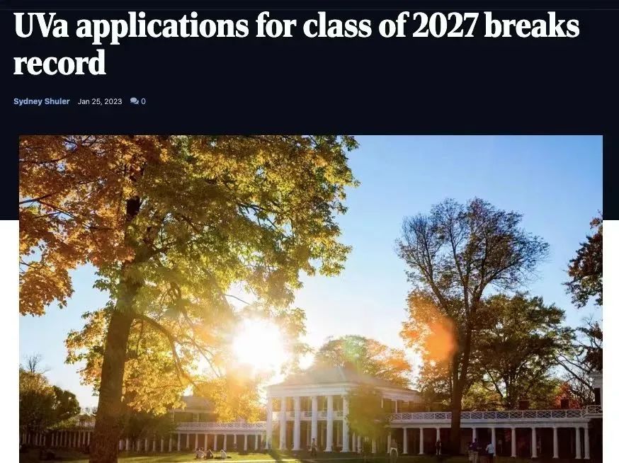 弗吉尼亚大学今年共收到55,845份申请,比去年同期的50813份增加了10%。 在55,845名申请者之中,有27%为常规批次申请(Regular Decision),65%在早期行动申请(Early Action),其余的8%为早期决定申请(Early decision)。占比情况与2026届的申请数据相近,只是EA申请比例比去年的61%有少许上涨。今年国际生的申请数量增长了4%,从6,000份增长至6,421份。