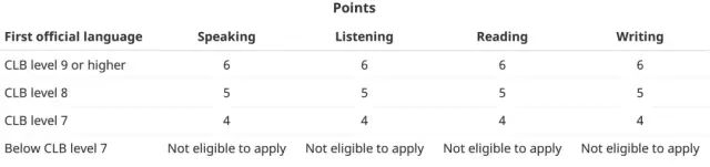 其中语言水平最高分28分,需要至少CLB 7 以上,即雅思G类至少4个6分才能有语言分数。