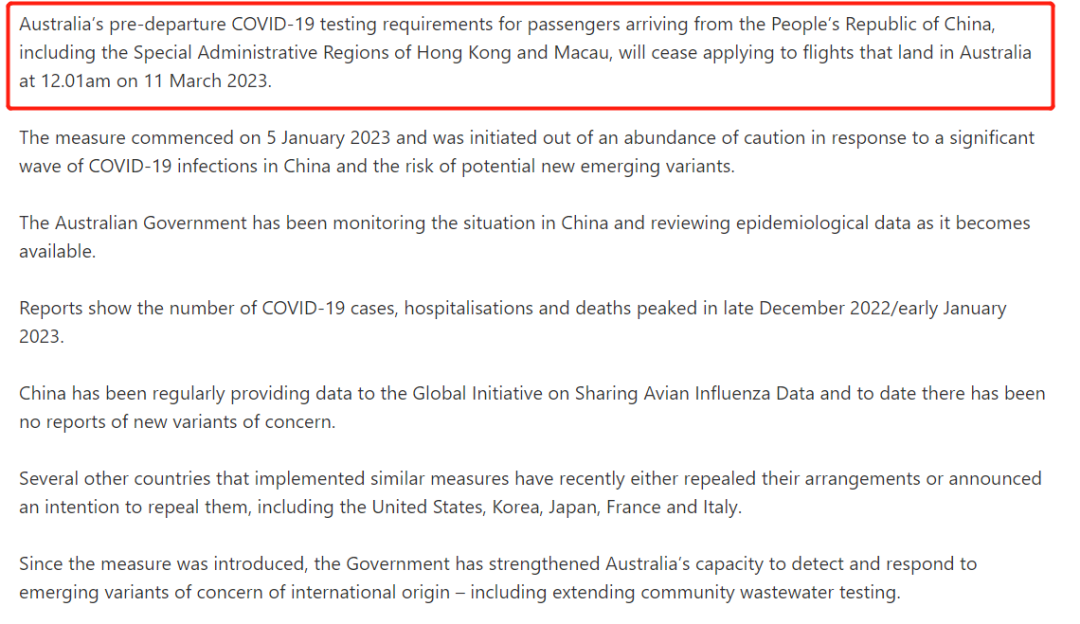 通告要求: 自2023年3月11日凌晨12:01后降落在澳洲的航班,所有中国(包括香港特别行政区和澳门特别行政区)的旅客,将不再要求提供COVID-19检测证明。