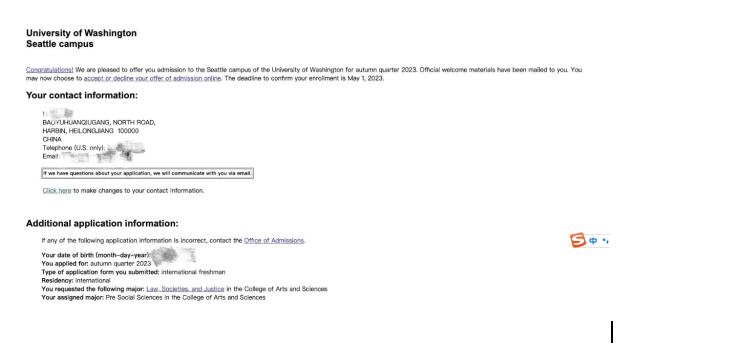 昨日,华盛顿大学西雅图校区2023秋本新录取放榜,祝贺金吉列留学哈尔滨分公司三名同学喜获OFFER!!! 今天给大家分享一下其中一位同学的录取条件及通知书: 美高在读,托福95,SAT免,GPA4.2/4.0, 活动背景丰富。