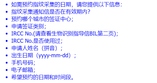 上图所示就是签证中心指纹采集预约信。在预约当天提前15分钟前往中心采集指纹。同时,需携带以下材料: