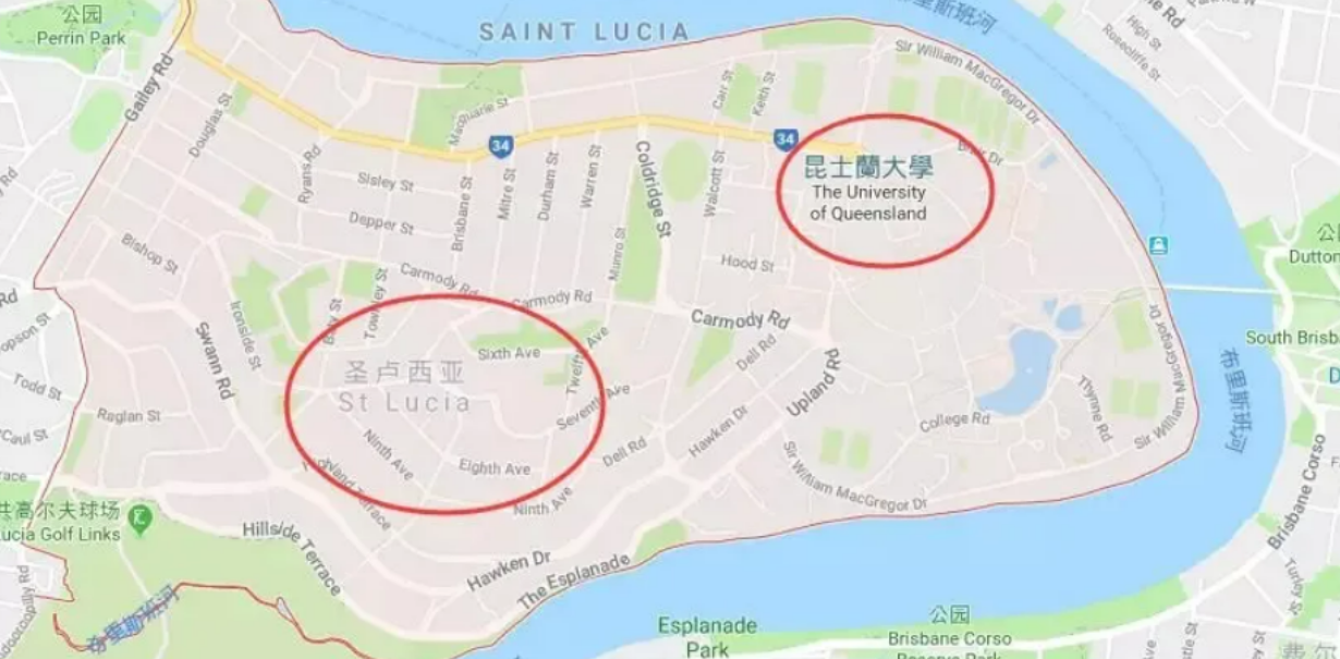 上面红色区域内都是 St lucia,可以说是所有区域离学校最近的,最近的步行几分钟到学校,最远也不过步行20分钟。因为离学校很近,所以这里被大家称为学霸区。