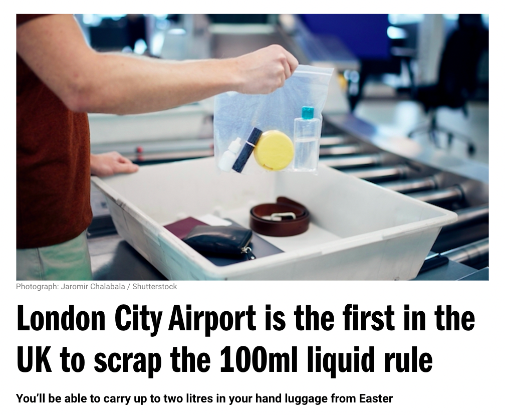 从复活节开始,伦敦城市机场(London City Airport)将废除禁止携带超过100ml液体的规定!