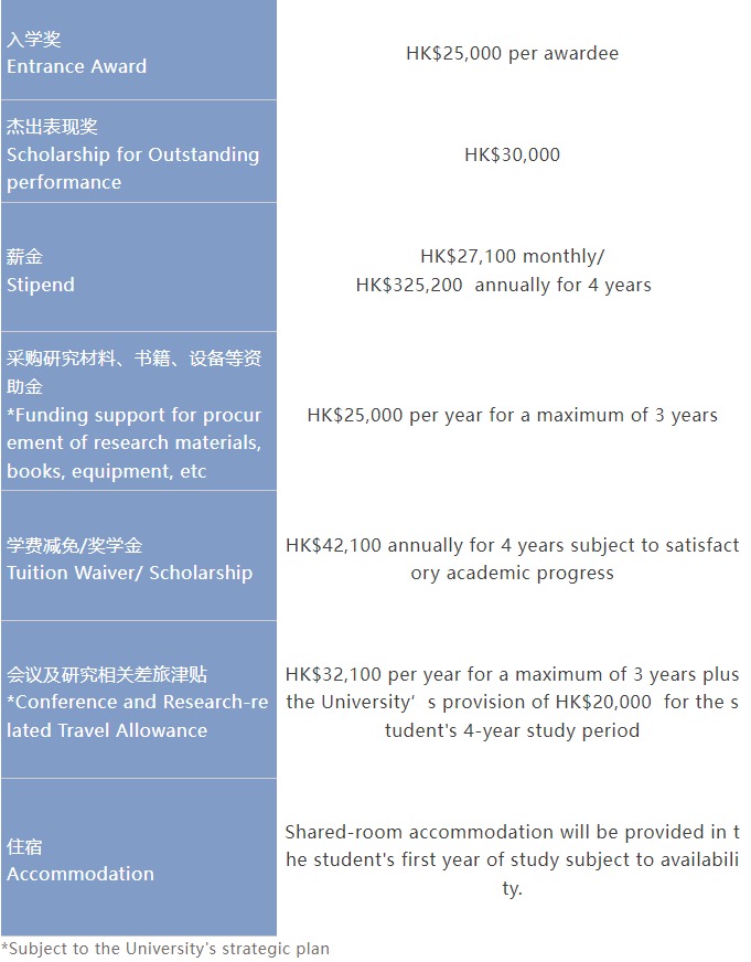 获奖的博士研究生每年可获得港币325,200元(约41,690美元) 的奖学金,及港币13,600元(约1,740美元)的会议及研究活动交通津贴,为期三年。 与大学常规研究式研究生相比,HKPFS无论从入学奖、杰出表现奖、学费减免政策及薪金补贴等各项津贴补助方面均更加丰厚且完善,所以非常推荐拥有杰出学术能力和研究潜质的青年学者,通过此计划入读香港大学。