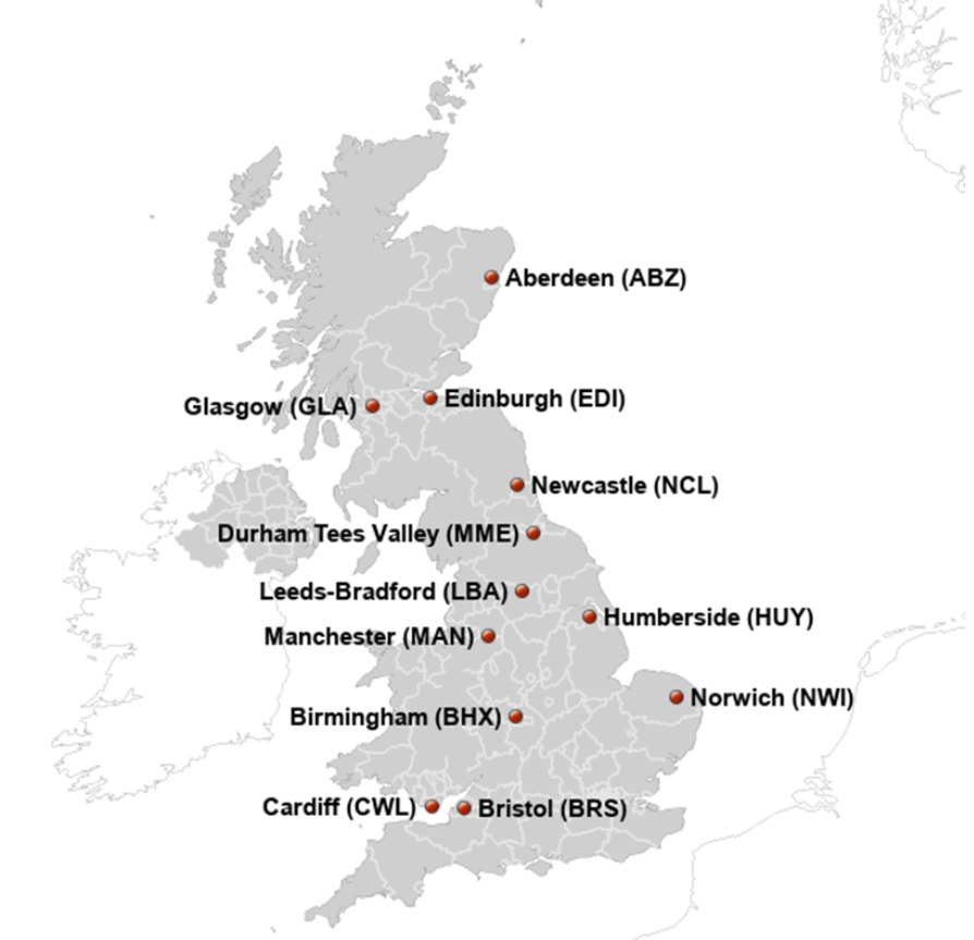 上面的地图展示了英国主要机场及位置,不过英国的最有名的国际机场还是以下几个,分别在伦敦、曼彻斯特、伯明翰、爱丁堡、格拉斯哥。