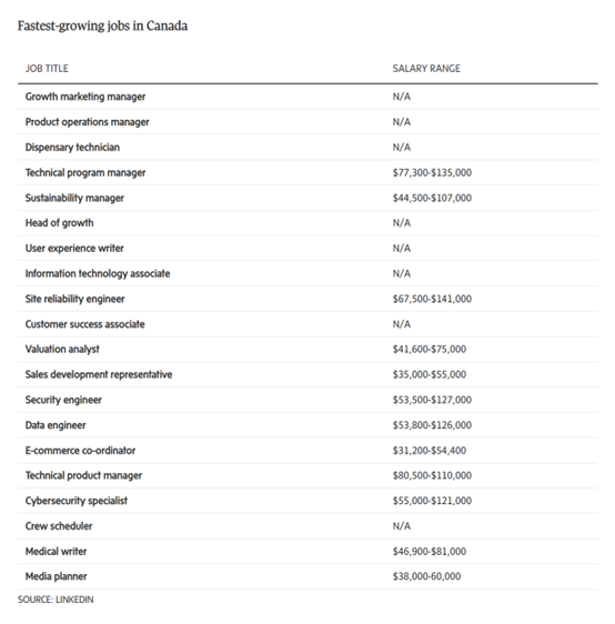 在LinkedIn统计的加拿大增长最快的行业中,IT类岗位占到了半数,要注意列表中的薪资范围仅仅是起薪。