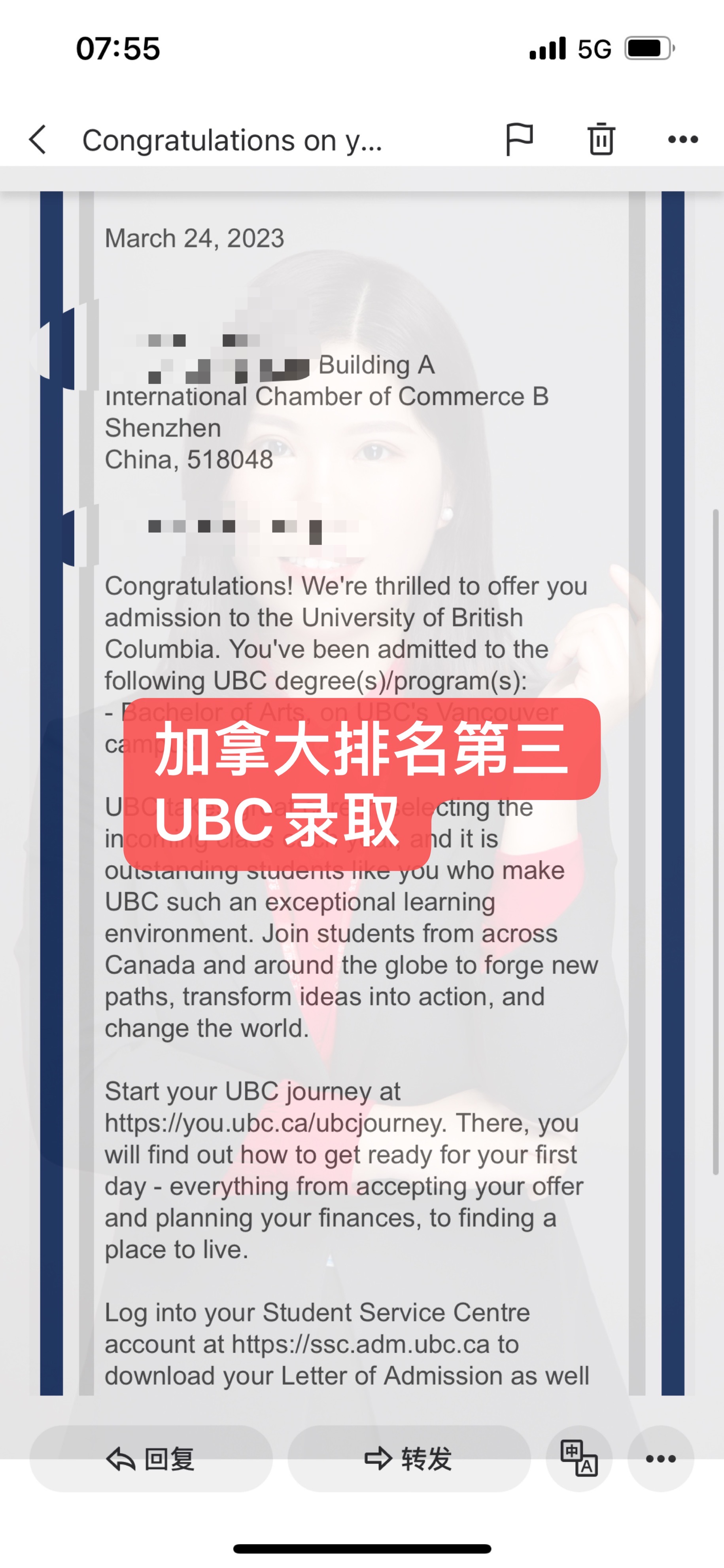 录取院校 :英属哥伦比亚大学UBC,多伦多大学(主校区),西蒙菲沙大学录取