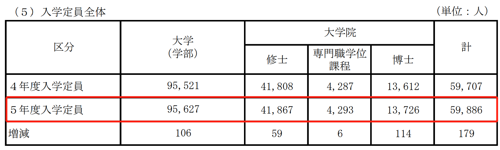 根据日本文部科学省发布的最新数据,2023年国立大学-学部入学定员相比前一年增加了106人,总数为9万5627人。大学院入学定员增加了179人,总数为5万9886人。