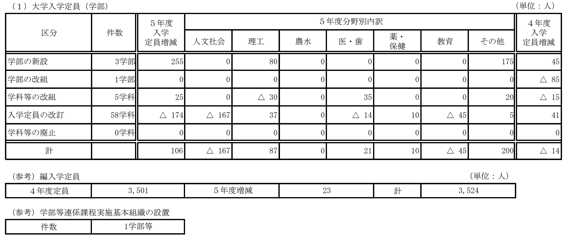 从专业类别来看,国立大学-学部入学定员有所增减的专业分野为:「人文社会」减少167人、「理工」增加87人、「农水」保持不变、「医·齿」增加21人、「药·保健」增加10人、「教育」减少45人;其他分野增加200人,合计增加106人。