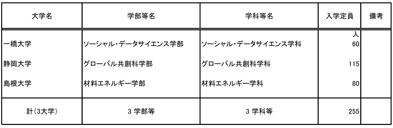 将于2023年设立的新学部包括:一桥大学社会数据科学学部(定员60人)、静冈大学全球共创科学部(定员115人)和岛根大学材料能源学部(定员80人)。