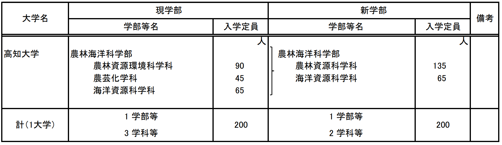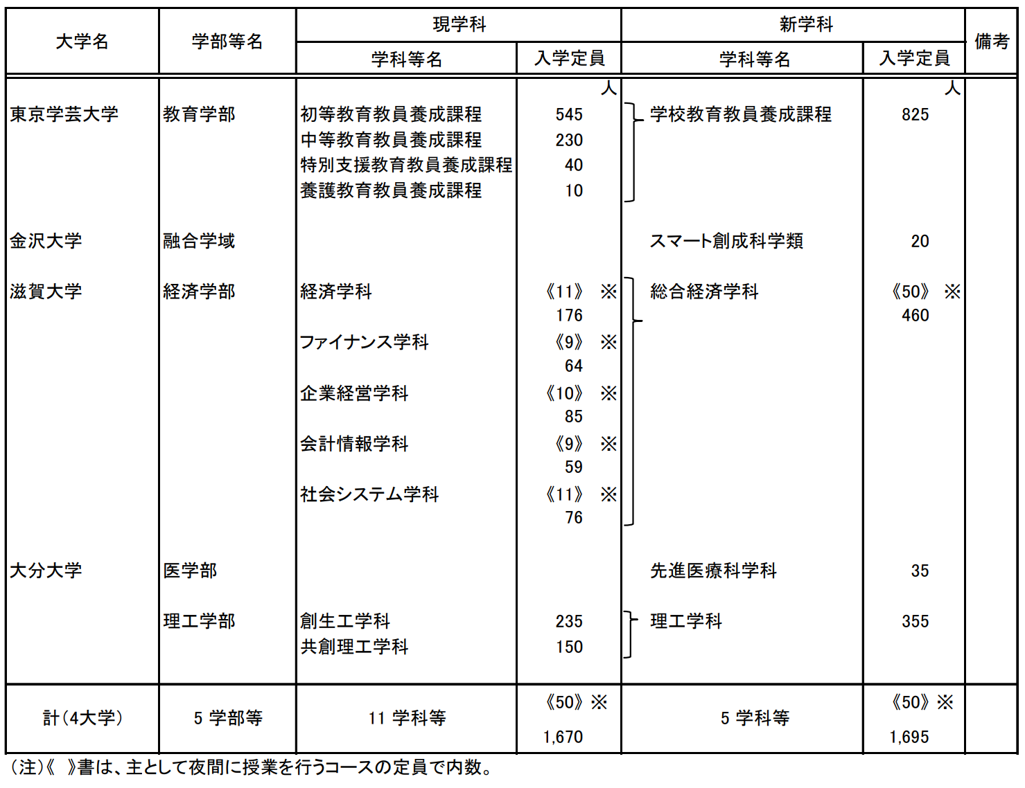 此外,高知大学农林海洋科学部计划进行学部重组,东京学艺大学教育学部、金泽大学融合学域、滋贺大学经济学部、大分大学医学部和理工学部计划进行部门重组。