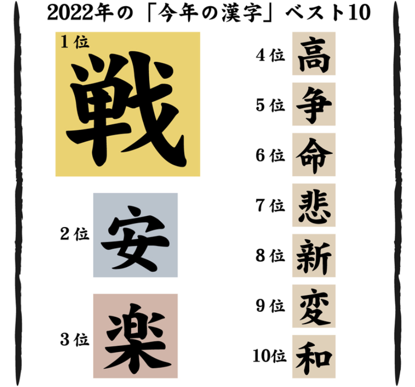 据日本汉字能力鉴定协会方面表示,“选出『战』字主要是因为俄乌冲突引人担忧,还有日元贬值、物价上涨等让很多人被迫与生活作战。