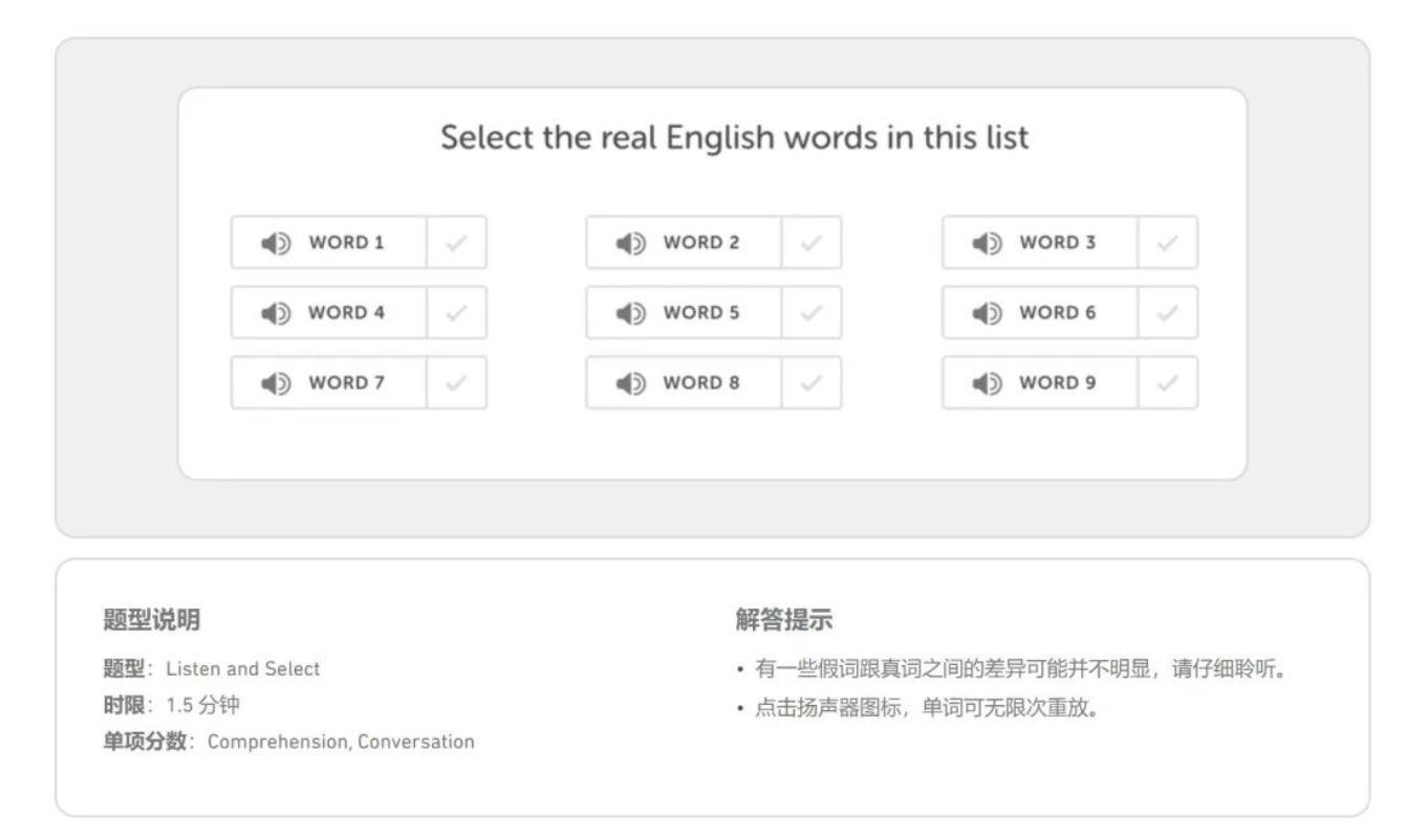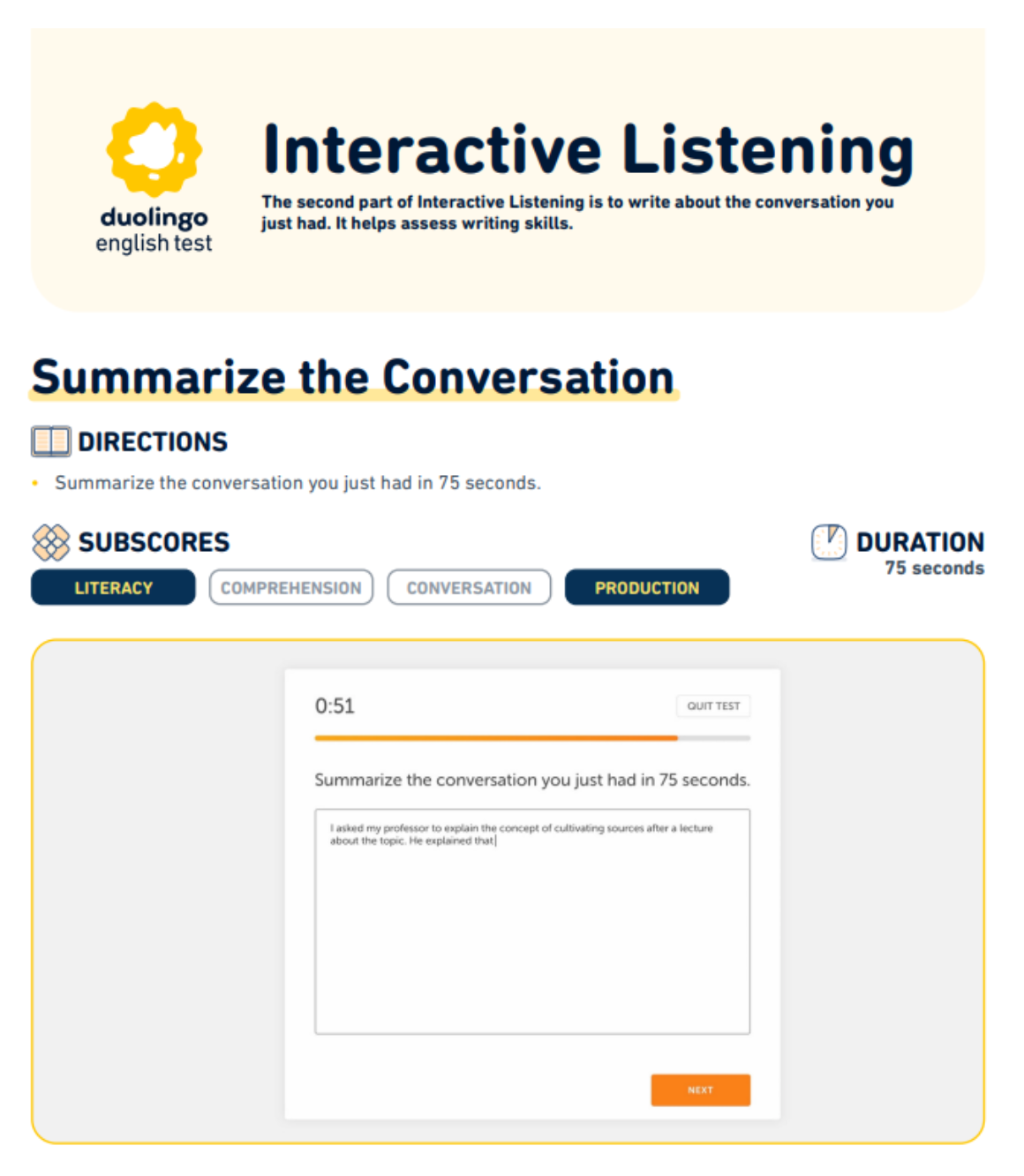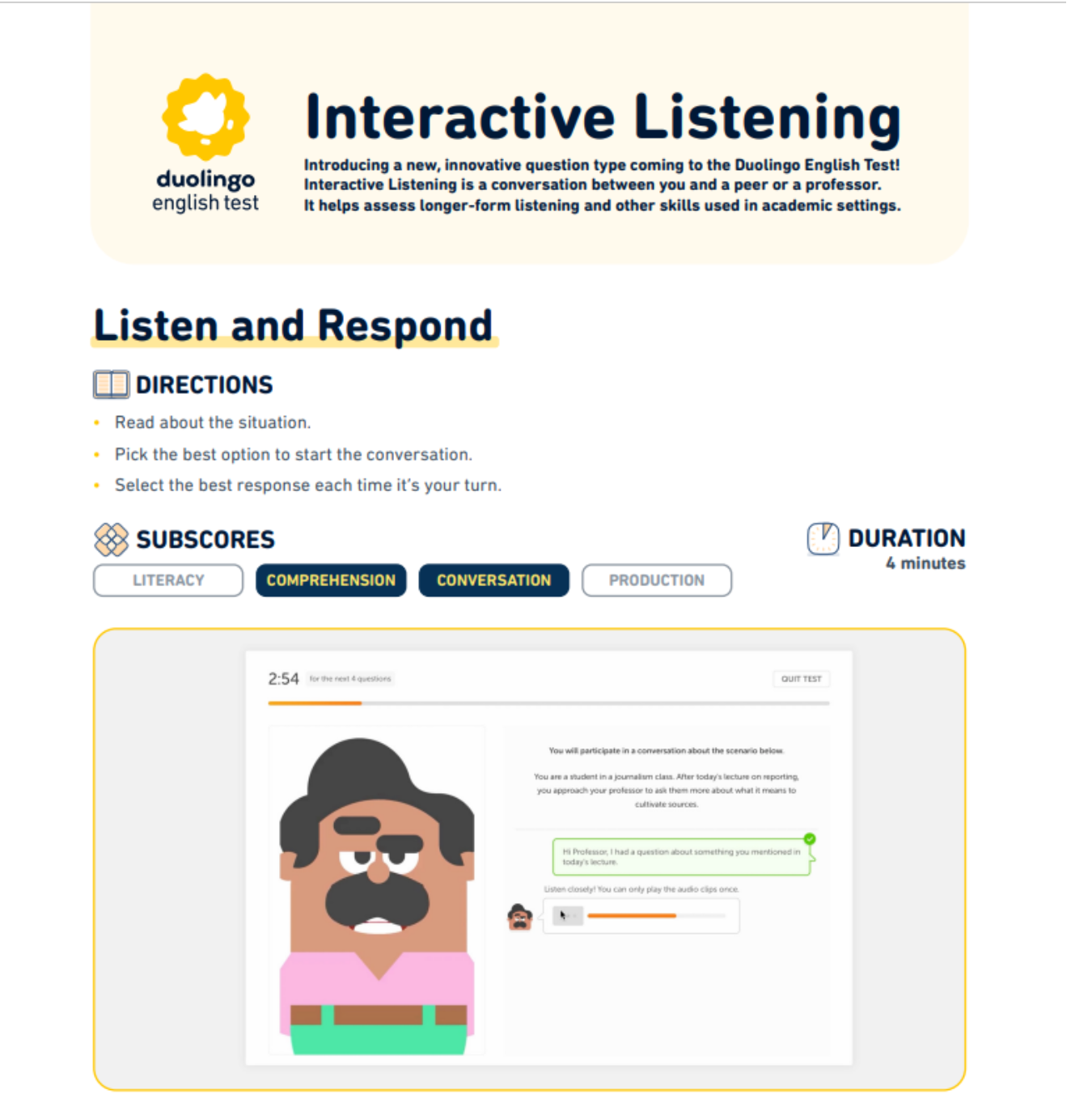 考生在互动听力题中的表现会影响到多邻国英语测试的总体分数。具体来说,每个场景的第一部分,即听力对答部分将影响 conversation 和 comprehension 的单项分数,而第二部分,即对话总结部分将影响 production 和 literacy 的单项分数。