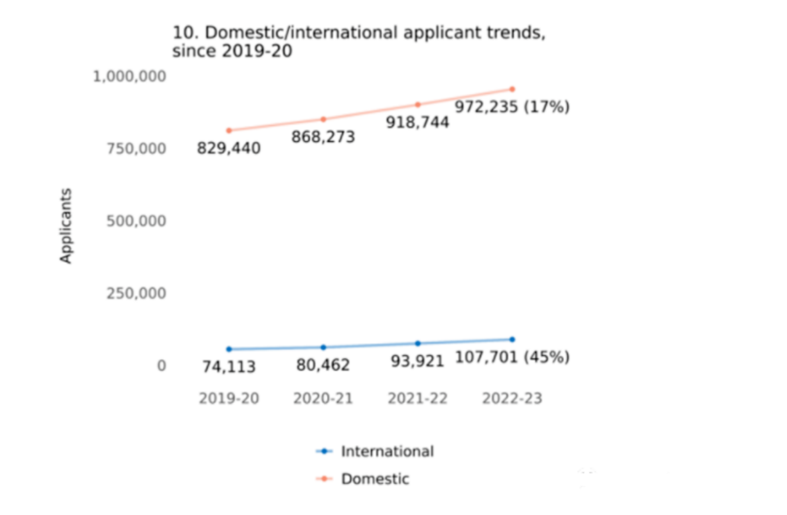 这一数字较上一申请季同期增长了14.67%,较2019-20申请季的74113人,更是增长了45.32%,是美国国内申请人数增长率(17%)的2.6倍。