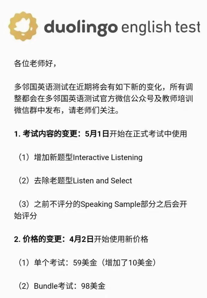 昨天,多邻国测试多邻国英语测试(Duolingo English Test)发布考试新动态,涉及考试题型、评分规则变化,以及考试费用调整。