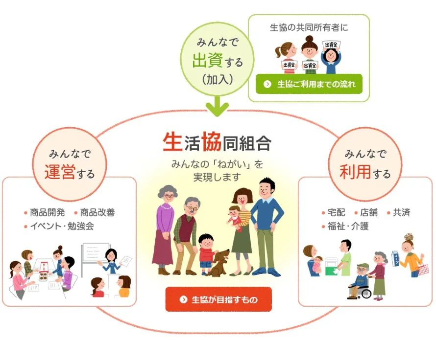 生协——「日本消费生活协同组合」。这名字乍一看,大家根本不知道它是干什么的。其实简单来说就是消费者出资成为会员,并由「日本消费生活协同组合」运营给广大民众提供生活上的便利。