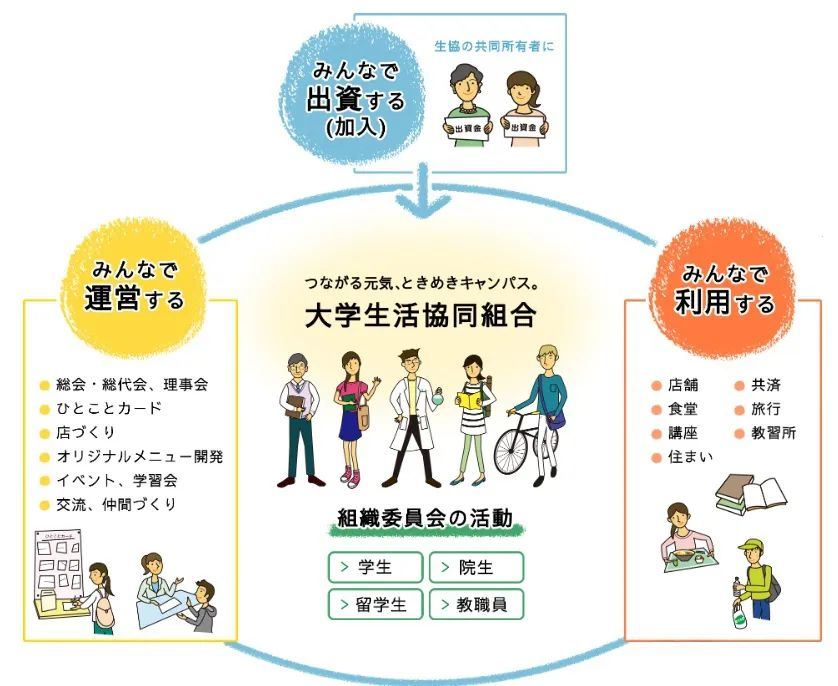 而大学生协的全称是「大学生活協同組合」,用比较中国一点的讲法就是大学里的合作社。成员们各自出资,共同运营共同使用。换言之,它就是一个由所有大学相关人员(包括本科生,研究生,留学生,教职员工)共享资金,合作运营的非营利组织,目的是丰富和发展大学校园生活,为校内人员提供生活上的便利和帮助。虽然有全国大学生活协同组织联合会的存在,但因为每个大学的生协都相当于是由大学创建的独立组织,你只能加入自己所属大学的生协,需要交的入会金额也根据大学各不相同。