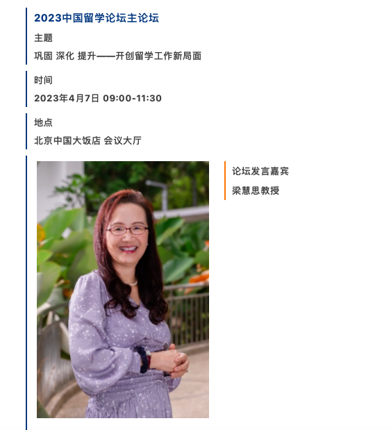 受巡回展主办方邀请,新加坡国立大学副教务长(硕士课程与终身教育)、持续与终身教育学院院长梁慧思教授(Prof. Susanna Leong)将作为发言嘉宾出席2023中国留学论坛主论坛。