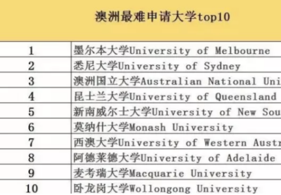 澳洲一共就那么42所大学,居然还能评出10所很难申请的,澳洲大学也是够拼的了。