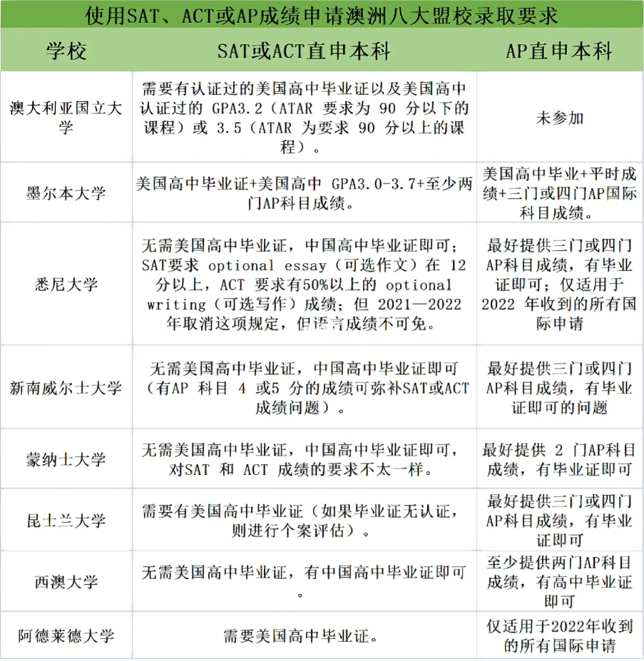3除了 A-Level 和 IBDP 这两种国际课程,也有不少学生用 SAT、ACT或者 AP成绩来申请澳大利亚的大学,尽管这些成绩都被澳大利亚的大学广为接受,但不同的大学有着不同的要求,可看下图具体要求。